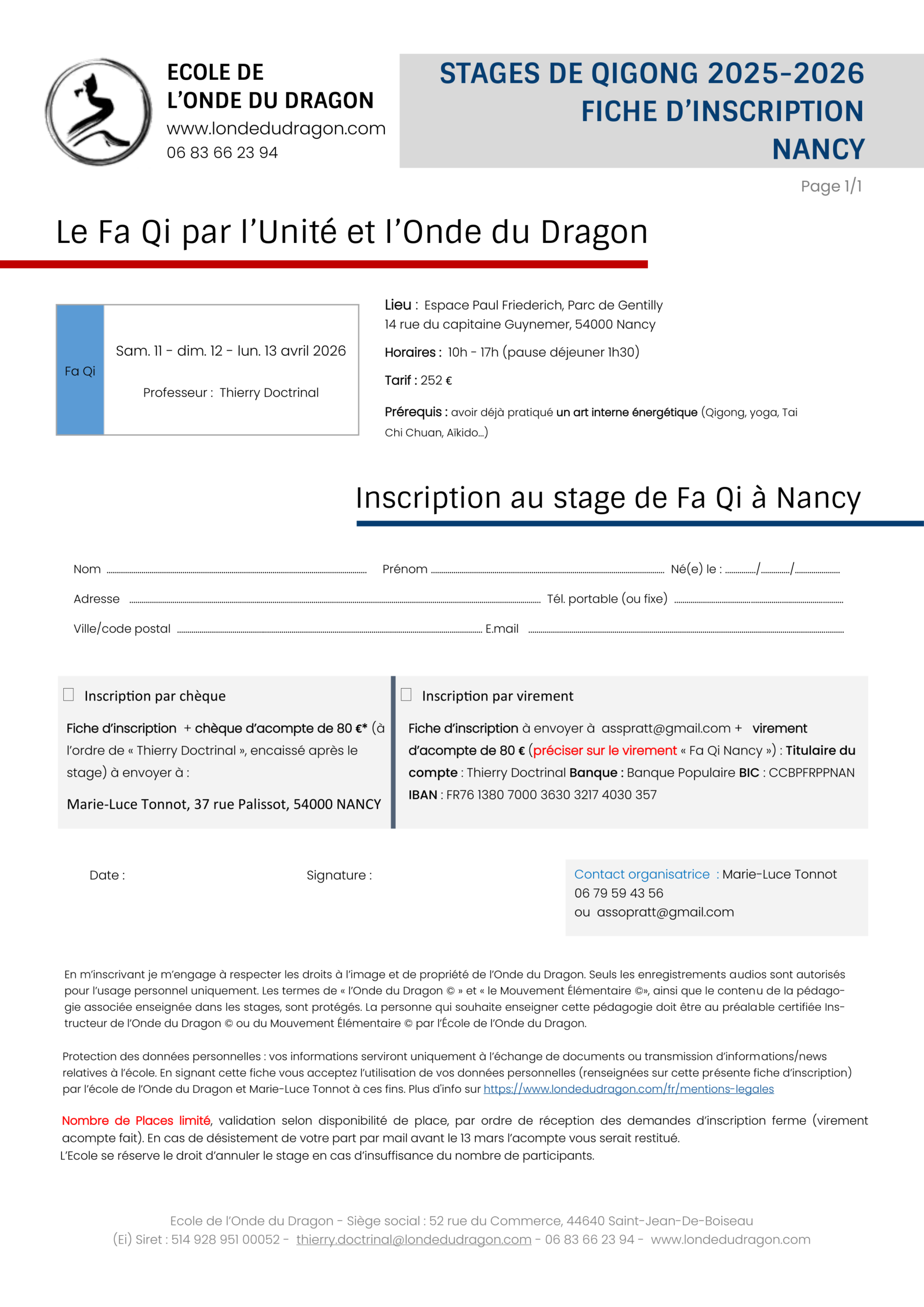 Informations complémentaires sur le site de l’école de l’Onde Du Dragon, onglet : stage, Fa Qi, Nancy.
